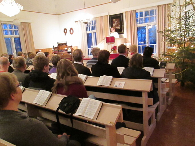 Rukoushuoneen rinne oli jo varhain joulupäivän aamuna valaistu kutsuvana monin kynttilän. Ennen kello yhdeksää kirkonpenkit olivatkin jo täyttyneet kirkkokansasta niin, että tuolia haettiin vielä lisäksi. Kirkkokansaa oli saapunut paikalle reilusti yli 50 henkilöä. Ulkona tihuttanut vesisade ei vähentänyt kyläkirkon sisälle ollutta lämpöistä ja rauhallista joulun tunnelmaa. Pappina toiminut Lainio-Nurminen käsittelikin saarnassaan nykyajan suorittamiskeskeistä yhteiskuntaa sekä tarvetta rauhoittua ja levätä, jolle joulu on juuri oivallinen hetki.  Kirkkokansa sai myös nauttia kyläläisen, Lena Nikkilän lauluesityksistä kanttori Leila Räsäsen säestämänä.