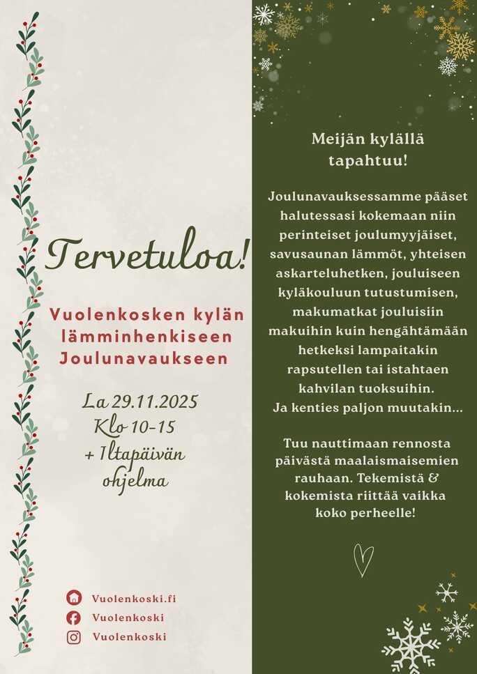 Koko kylän yhteistä ja ihka ensimmäistä joulunavausta vietetään lauantaina marraskuun 29.päivä. Kylämme joulu saa ansaitsemansa komian ja kylälle ominaisen aloituksen täynnä jouluista tunnelmaa, puuhaa ja makuja! Mitä kaikkea päivä tuokaan tullessaan, siitä saamme kuulla jouluisten tietoiskujen merkeissä pitkin syksyä, joten pysyhän kuulolla. Ajankohtaiset tiedot löydät myös kylän sosiaalisen median kanavista sekä täältä virrasta: Joulunavaus