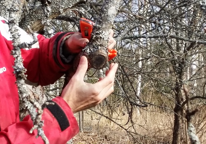 Mallipuuksi valikoitunut 3-kymppinen kaunotar sai käsittelyssä rohkean makeoverin. Pienemmät oksat katkaistaan oksasaksilla (ohileikkaavat, ehdottomasti OHILEIKKAAVAT), isommat näppärällä oksasahalla. Jouduttiinpa tässä turvautumaan moottorisahaankin, kun radikaaliin amputaatioon päädyttiin riittävän valonsaannin turvaamiseksi. Viimeistelytyöt hoituvat terävällä puukolla.