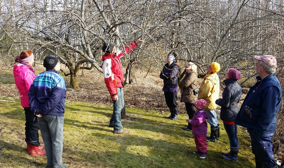 Tuulisena torstaipäivänä kokoontui Mimmin ihastuttavaan puutarhaan, henkevien vanhojen omenapuiden katveeseen, kymmenkunta innokasta Multapossukerholaista. Alkamassa oli demonstraatio aiheesta omenapuun leikkaus. Oma kylänmiehemme, Herra mm.puutarhurihortonomi Petteri Voutilainen, tuo omenalehtojen Cliffhanger, toimi oppaanamme matkalla omenapuiden kiehtovaan kehityskaareen.