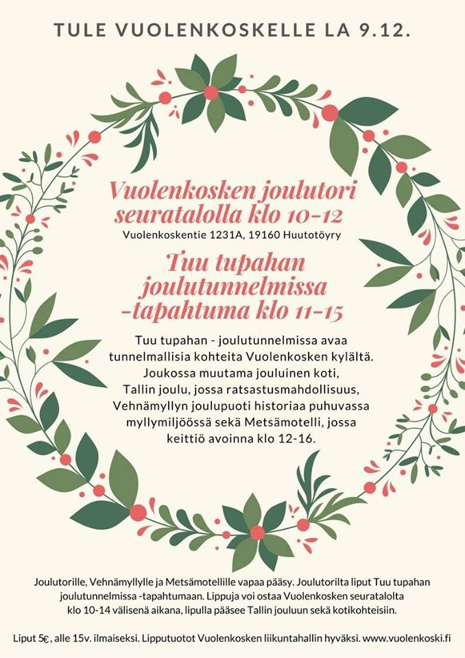 Tulevana lauantaina 9.12. Vuolenkoskella järjestetään perinteinen joulutori klo 10-12 Vuolenkosken seuratalolla. Samalla tunnelmloidaan joulua Tuu tupahan joulutunnelmissa -tapahtuman merkeissä. Tuu tupahan joulutunnelmissa avaa kolme kotikohdetta, Tallin joulun Finskaksella, vanhan palotallin sekä Vehnämyllyn joulupuodin klo 11-15 Vuolenksoken kyläalueella. Lisäksi Metsämotellilla klo 12-16 ruokailumahdollisuus.