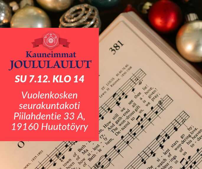 Kauneimmat joululaulut Vuolenkosken seurakuntakodilla sunnuntaina 7.12. klo 14. Tervetuloa!
