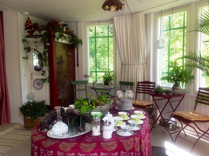 Talonpäädyn lasiverannasta on tullut houkuttava olotila, jonka sisustamme aina uudelleen tarpeiden mukaan: illanistujaisiin, elokuun ravintolapäivään, puuhastelupaikaksi. Siellä syntyvät talven aikana uudet suunnitelmat pihapiiriin. Nyt piirtelemme ikkunaluukkuja rakennettavaan liiteriin ja ompelen vanhoista nenäliinoista lippujanoja tuleviin tapahtumiin.